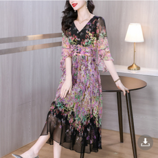 줄리엣이뽀 실크 프린트 드레스 여름 레트로 하이엔드 슬림 웨이스트 브이넥 러플 플로럴 실크 롱 스커트 KJK-5138