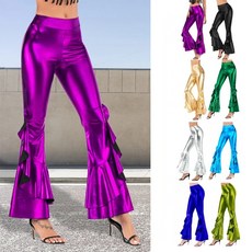 여성 반짝이 플레어 바지 메탈릭 웨트룩 프릴 와이드 레그 팬츠 나팔바지, C