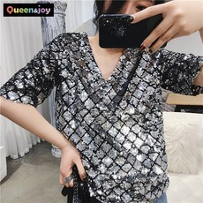 퀸앤조이 샤이니 스팽글 브이넥 블라우스
