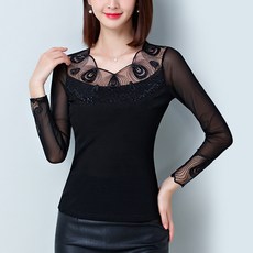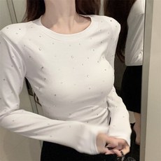 페이준 여성 고급스러운 중공업 스팽글 티셔츠 가을겨울 모던한 이너로 시크한 긴팔 상의 CE9384