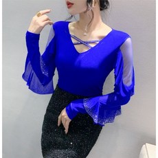페이준 봄가을 레이스 쉬폰 패치 니트 긴팔 브이넥 시스루 티셔츠 라인 라틴 댄스복상의 1750A