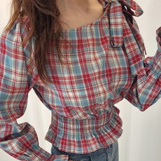 나인클로젯 오프 숄더 타이 리본 체크 블라우스 여성 겨울 어깨 트임