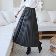 봉봉스토리 파이 페이크레더 플레어 주름 롱 스커트 여성용