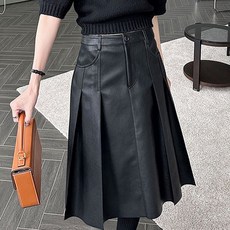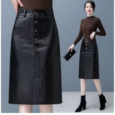 셀럽당 앞트임 원터치 힙 스커트 여 미디 기장 하이웨스트 A라인 일자 PU 가죽 반신 스커트